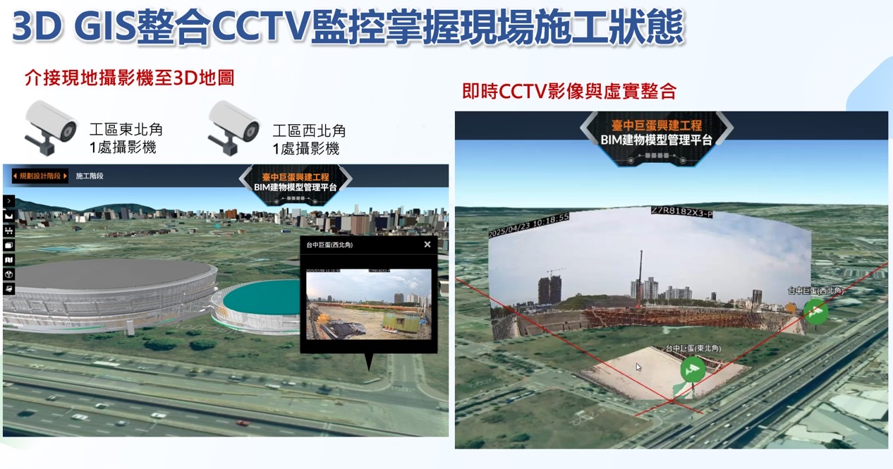 陳局長表示,此次與國研院國網中心合作,結合地理資訊系統(GIS)與建築資訊模型(BIM),並導入數位孿生、人工智慧及AI影像辨識等新技術,成功建置三維GIS資訊系統,以三維視角即時呈現場館結構、施工進度及智慧安防資訊,讓工程執行進程與建築模型成果一目了然。台中巨蛋工程規模龐大、工項複雜,是新技術驗證的最佳示範場域,不僅可驗證智慧科技於實務上的可行性,也能透過數位模擬方式「看見未來巨蛋」,協助建設團隊精準掌握工程進度、控管安全風險,進而提升整體工程管理效益與決策效率。